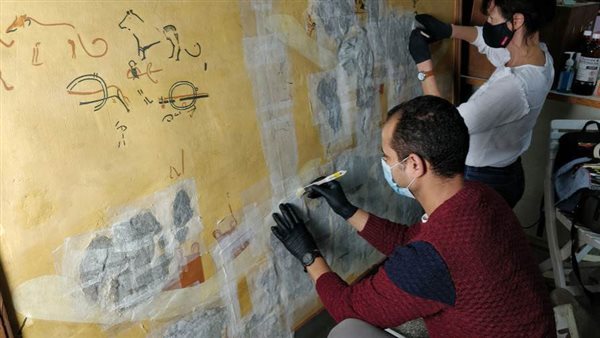ومن جانبه قال د. عبد الرحمن مدحت أخصائي ترميم بالمتحف المصري، انه تم فحص الرسم الجداري قبل البدء في أعمال ترميمه، وتوثيقه وتقييمه عن طريق التصوير بتقنية الأشعة فوق البنفسجية والتصوير بالأشعة تحت الحمراء.