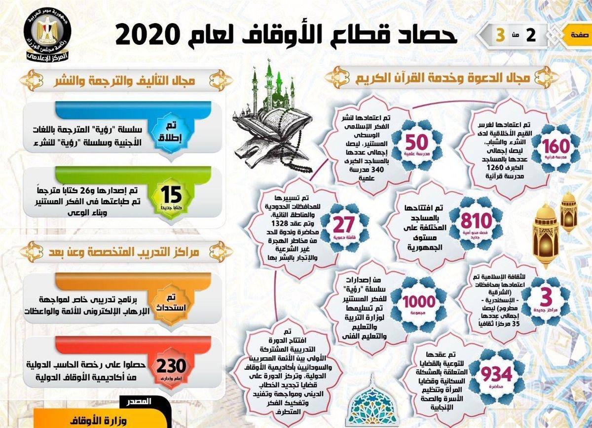 وفي إطار سلسلة متتابعة من التقارير لرصد إنجازات الحكومة في 2020، نشر المركز الإعلامي لمجلس الوزراء، تقريراً تضمن إنفو جرافات تسلط الضوء على حصاد قطاع الأوقاف لعام 2020.