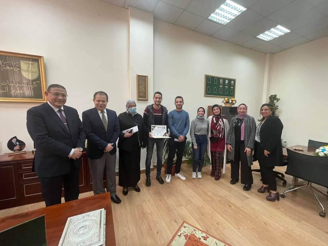 قامت إدارة الكلية أمس الأحد متمثلة الدكتور أحمد وهبان عميد الكلية والدكتور.أسامة العادلي وكيل الكلية لشؤون التعليم والطلاب والدكتورة شيرين نصير وكيل الكلية للدراسات العليا والبحوث وبحضور مروة حجازي مدير إدارة رعاية الشباب، بالاحتفاء بالابن البار "يسر الدين" في حفل أنيق ومنحه شهادة تقدير على جهوده المتميزة ومساعيه الدؤوبة في دعم زملائه الطلاب. وقد أثنى الحضور على ما يتمتع به من خلق دمث وحرص على مصالح زملائه الطلاب.