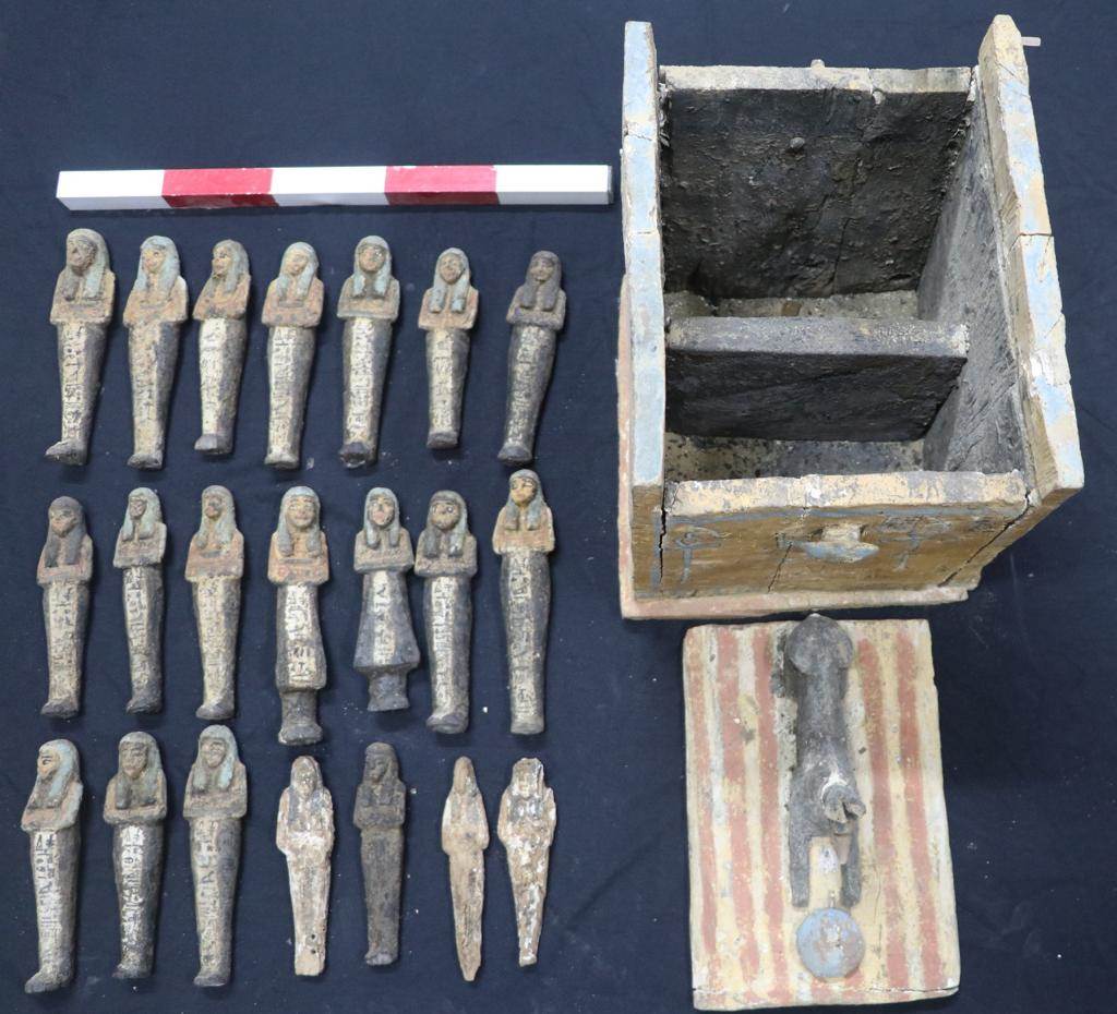 وقد عثرت البعثة داخل الآبار على أعداد كبيرة من المشغولات الأثرية و تماثيل على هيئة المعبودات مثل الاله اوزير، وبتاح، وسوكر، واوزير، بالإضافة إلى كشف فريد من نوعه، حيث عثرت البعثة على بردية يصل طولها إلى أربعة أمتار ومتر واحد عرض، تمثل الفصل السابع عشر من كتاب الموتى، ومسجل عليها اسم صاحبها وهو (بو-خع-اف) وقد وجد نفس الاسم مسجل على أربعة تماثيل أوشابتي. كما تم العثور على تابوت خشبي على الهيئة الادمية لنفس الشخص، بالإضافة إلى العديد من تماثيل الأوشابتي من الخشب والحجر الفيانس من عصر الدولة الحديثة.