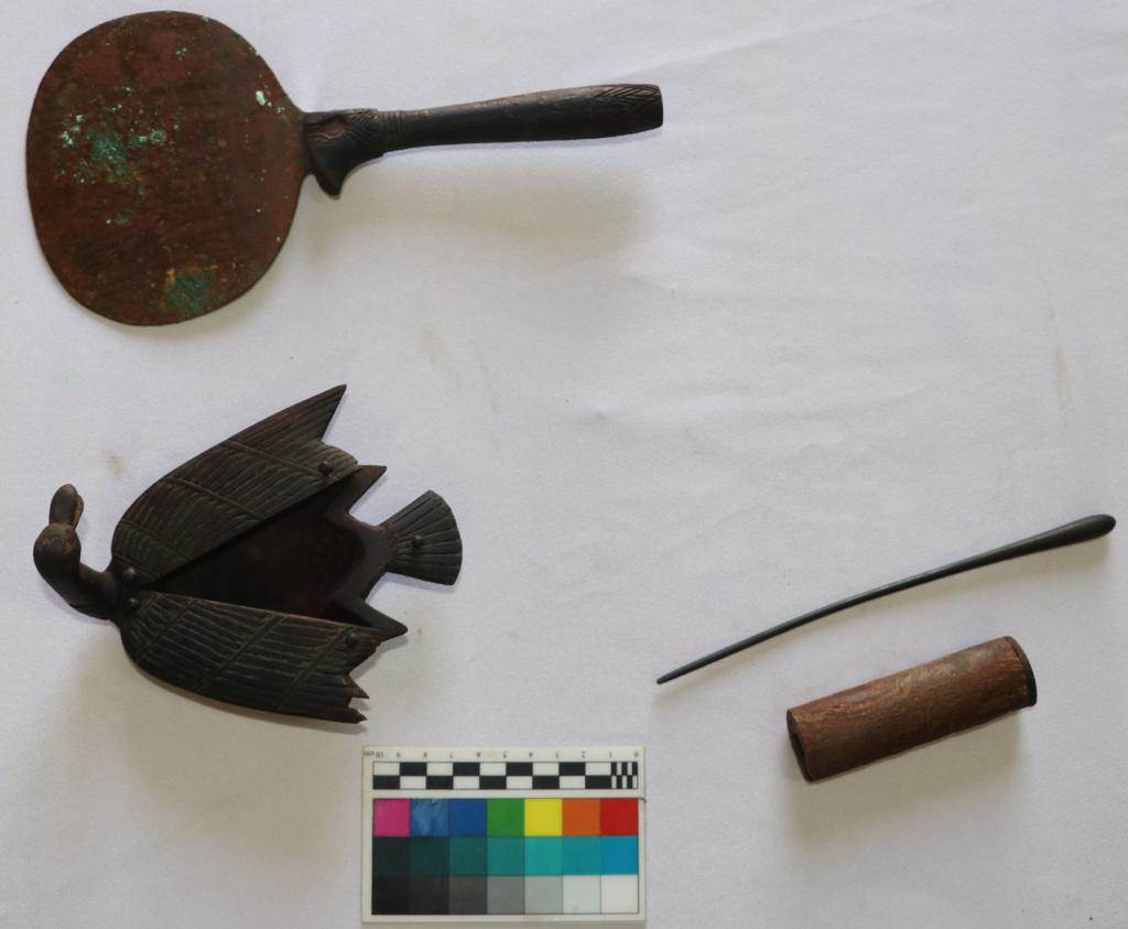 كما تم العثور على العديد من القطع الأثرية التي تمثل طيور مثل أوزه، وبلطة من البرونز تدل على أن صاحبها كان أحد قادة الجيش في عصر الدولة الحديثة والعديد من اللوحات المنقوشة عليها مناظر المتوفى وزوجته وكتابات الهيروغليفية؛ من أجملها لوحة من الحجر الجيري في حالة جيدة من الحفظ ، مصور عليها منظر متوفى يدعى (خو-بتاح) وزوجته تدعى (موت-ام-ويا). الصف العلوي من اللوحة يصور المتوفى وزوجته في وضع تعبدي أمام المعبود أوزير والصف السفلي يصور المتوفى جالسا وزوجته خلفه، وتحت كرسي الزوجة مثلت إحدى بناتهما جالسة تقرب إلى أنفها زهرة اللوتس ويزين رأسها بالقمع العطري.