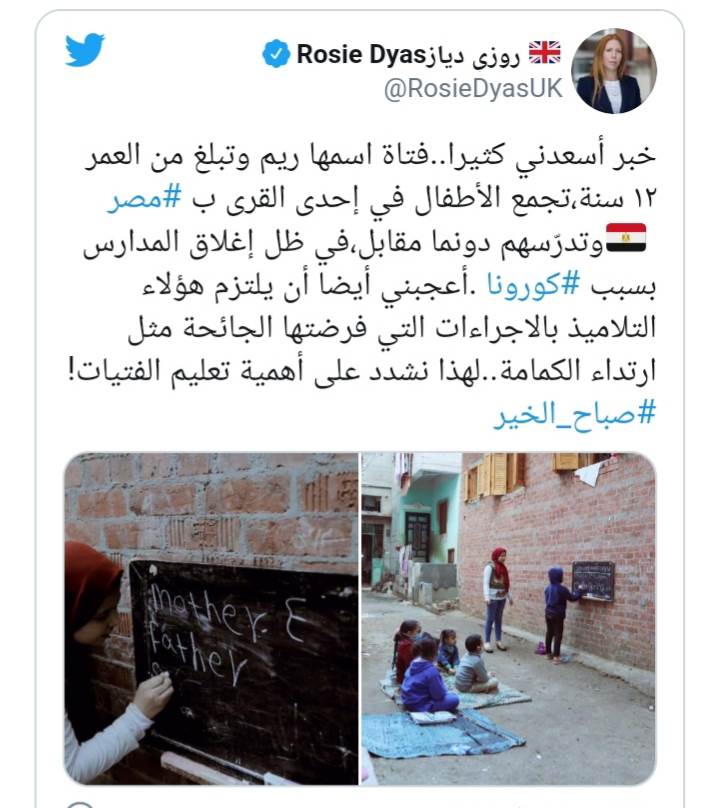 وكتب روزي بن دياز: "خبر أسعدني كثيرا... فتاة اسمها ريم وتبلغ من العمر 12 سنة. تجمع الأطفال في إحدى القرى بمصر وتدرسهم دونما مقابل، في ظل إغلاق المدارس بسبب كورونا".