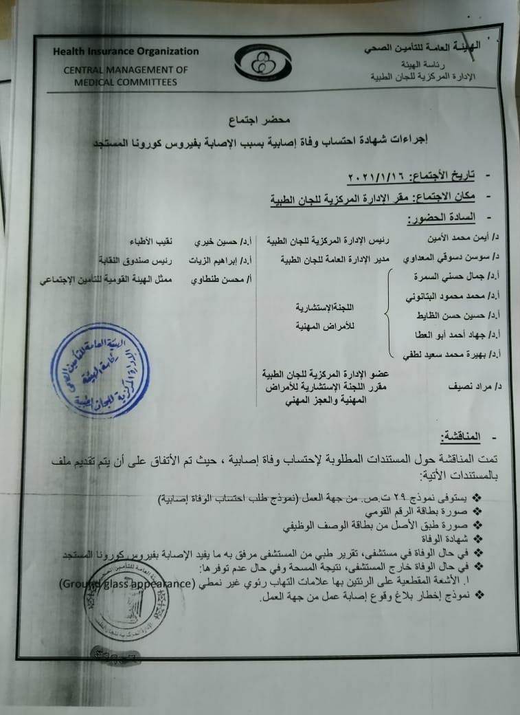 أما عن المستندات المطلوبة لإحتساب الوفاة إصابية ..فقد تم الإتفاق على ان يتم تقديم ملف يحتوى المستندات الأتية: