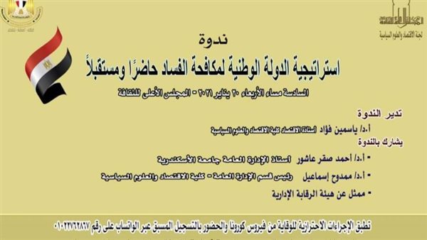 ويدير الندوة: الدكتورة ياسمين محمود أستاذ مساعد قسم الاقتصاد والتمويل بكلية الاقتصاد والعلوم السياسية جامعة القاهرة، ويشارك بها كل من: ممثل عن هيئة الرقابة الإدارية بجمهورية مصر العربية، والدكتور أحمد صقر عاشور أستاذ الإدارة العامة جامعة الأسكندرية، والدكتور ممدوح إسماعيل رئيس قسم الإدارة العامة بكلية الاقتصاد والعلوم السياسية والمسؤول عن ملف استراتيجية مكافحة الفساد بجامعة القاهرة .