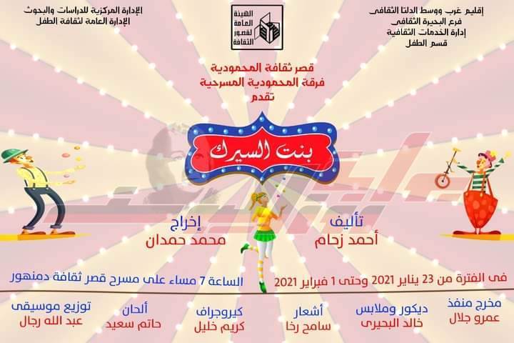 ويعرض على مسرح قصر ثقافة دمنهور، ابتداءً من غدٍ السبت الموافق ٢٣ يناير وحتى ١ فبراير العرض المسرحي "بنت السيرك" لقصر ثقافة المحمودية للأطفال والكبار؛ حيث يفتح الستار ٧م، والدخول مجانًا بأسبقية الحضور لأول ١٠٠ متفرج، مع الالتزام بكل الإجراءات الاحترازية، ويمنع الدخول بغير الكمامة وطوال مدة العرض.