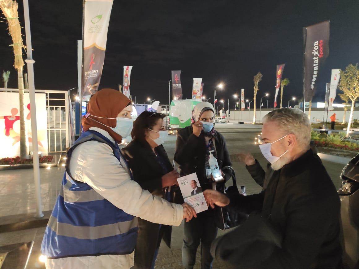 وتقوم فرق المثقفين الصحيين بوزارة الصحة والسكان بتقديم التوعية اللازمة بالإجراءات الوقائية والاحترازية لفيروس كورونا المستجد لجميع المشاركين في البطولة، من خلال الأكشاك الطبية المتواجدة داخل الاستادات الرياضية وأمام صالات الألعاب.