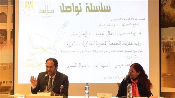 افتتحت الأمسية الدكتورة عزة بدر مؤكدة الدور الثقافى المهم الذي تقدمه سلسلة تواصل؛ والتي تلقى الضوء على مختلف الأصوات الأدبية والفنية، ثم ذهبت الكلمة إلى الدكتورة نهلة إمام، التي أكدت أن الجمعية المصرية للمأثورات الشعبية أعدت ملف حول النسيج اليدوى بالصعيد، وأرسلته إلى منظمة اليونسكو لتسجيله ضمن اتفاقية: "صون التراث الثقافى غير المادى العالمى".