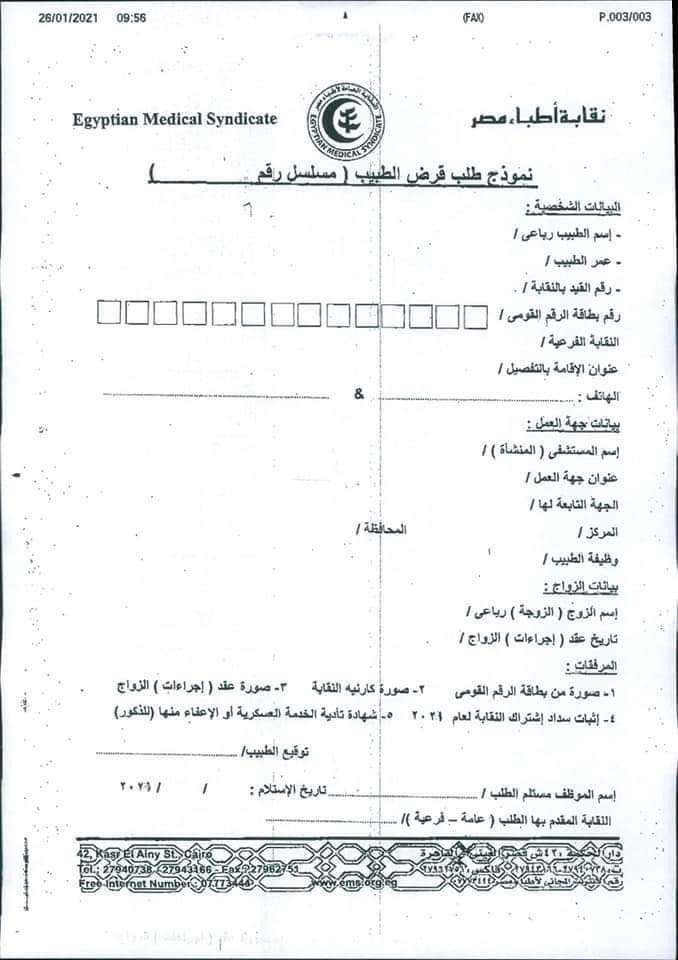 ٣- يتم إجراء القرعة العلنية خلال شهر مارس 2021 بدار الحكمة، التقدم عن طريق ملء استمارة القرض بالنقابات الفرعية، أو النقابة العامة للأطباء.