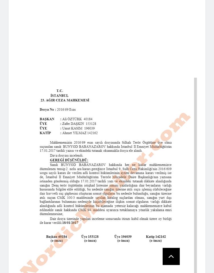 وجند بابانازاروف نفسه في عملية انتحارية مع قادة داعش، وفقًا لتقرير المخابرات في سجلات شرطة إسطنبول، وفي 22 أكتوبر 2016 داهمت الشرطة منازل تابعين لداعش واعتقلت المشتبه بهم. وأظهرت السجلات المالية أنهم تلقوا آلاف الدولارات، وتم القبض على بعضهم رسمياً وحبسهم لمدة شهر، بينما أطلق سراح آخرين.