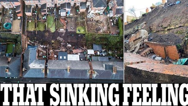 شهدت منطقة سنينتون، في نوتنجهام الإنجليزية، انهيار أراضٍ بطول 70 قدمًا ضد مستوى أعلى من المنازل، ما أدى إلى سقوط الطوب والركام في حدائقهم الخلفية ما أدى لإجلاء خمس عائلات من منازلهم في منتصف الليل.