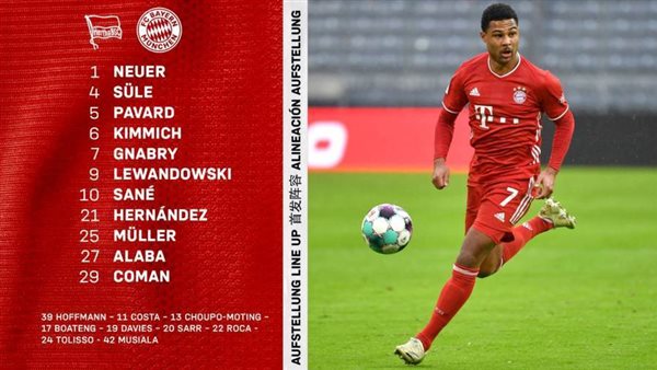 أعلن هانز فليك، المدير الفني لفريق بايرن ميونخ، تشكيل فريقه لمواجهة هيرتا برلين، في الجولة العشرين لبطولة الدوري الألماني لكرة القدم.