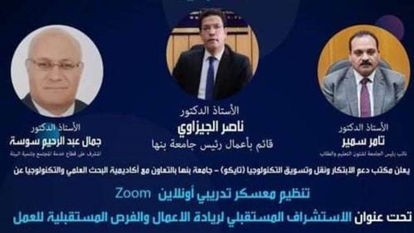 ينظم مكتب دعم الابتكار ونقل وتسويق التكنولوجيا “تايكو”- جامعة بنها بالتعاون مع أكاديمية البحث العلمي والتكنولوجيا معسكرا تدريبيا أونلاين Zoom تحت عنوان "الاستشراف المستقبلي لريادة الأعمال والفرص المستقبلية للعمل".