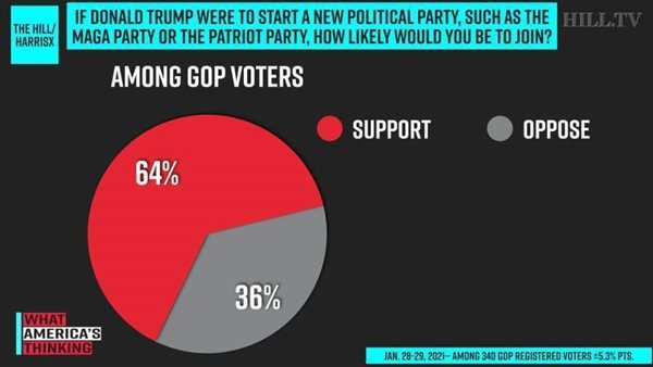 قال 64 % من الناخبين الجمهوريين المسجلين في استطلاع رأي يوم 28-29 يناير الماضي وبعد أسبوع من ترك ترامب السلطة أنهم سينضمون إلى حزب سياسي جديد بقيادة الرئيس السابق، بما في ذلك 32% ممن قالوا إنهم سينضمون على الأرجح.