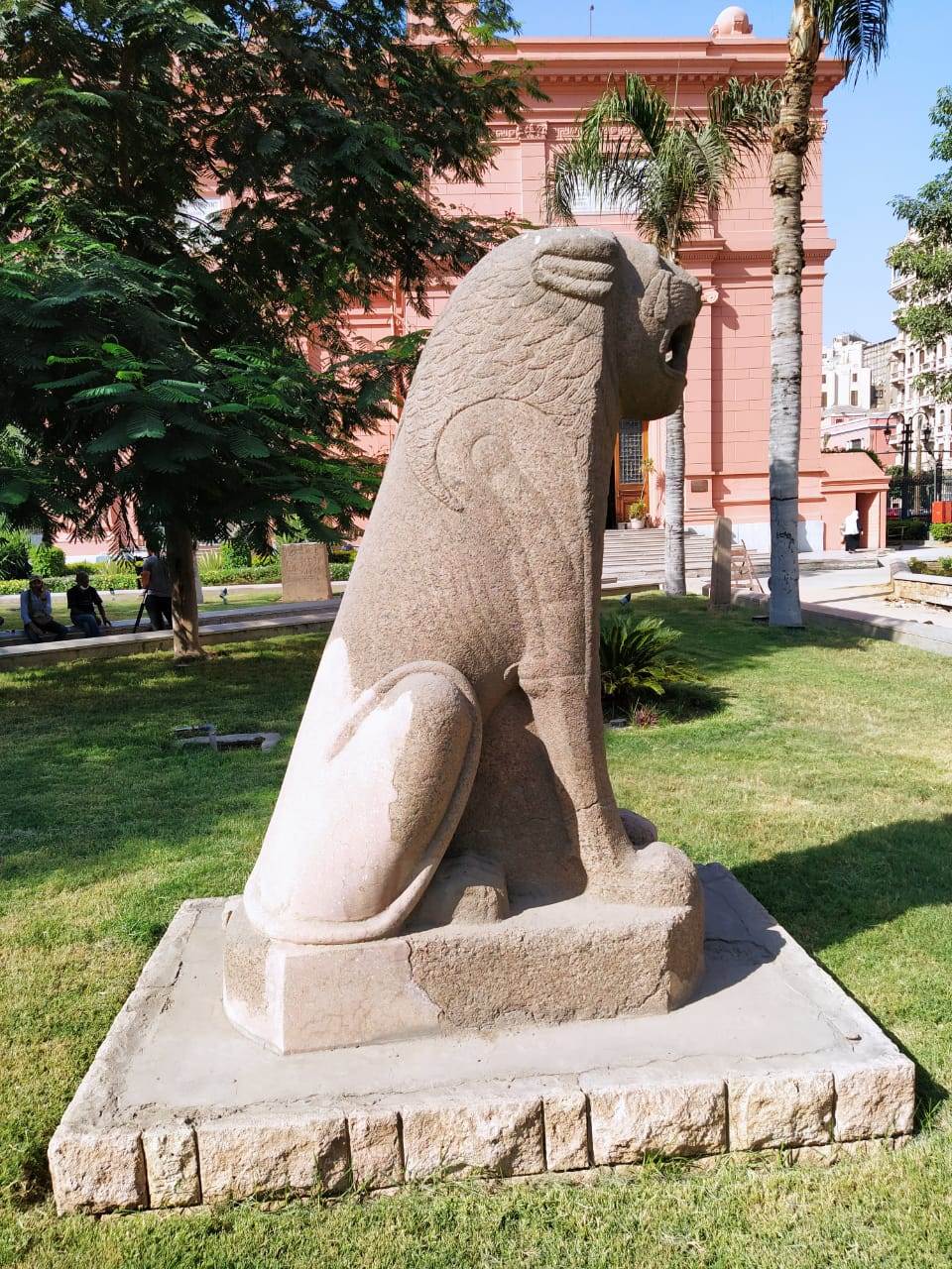 أما بالنسبة لتمثال الأسد الموجود بواجهة المتحف، فهو بحالته التي كان عليها قبل نقله من حديقة المتحف المصري بالتحرير حيث كان مرمما ومعروضا بها.