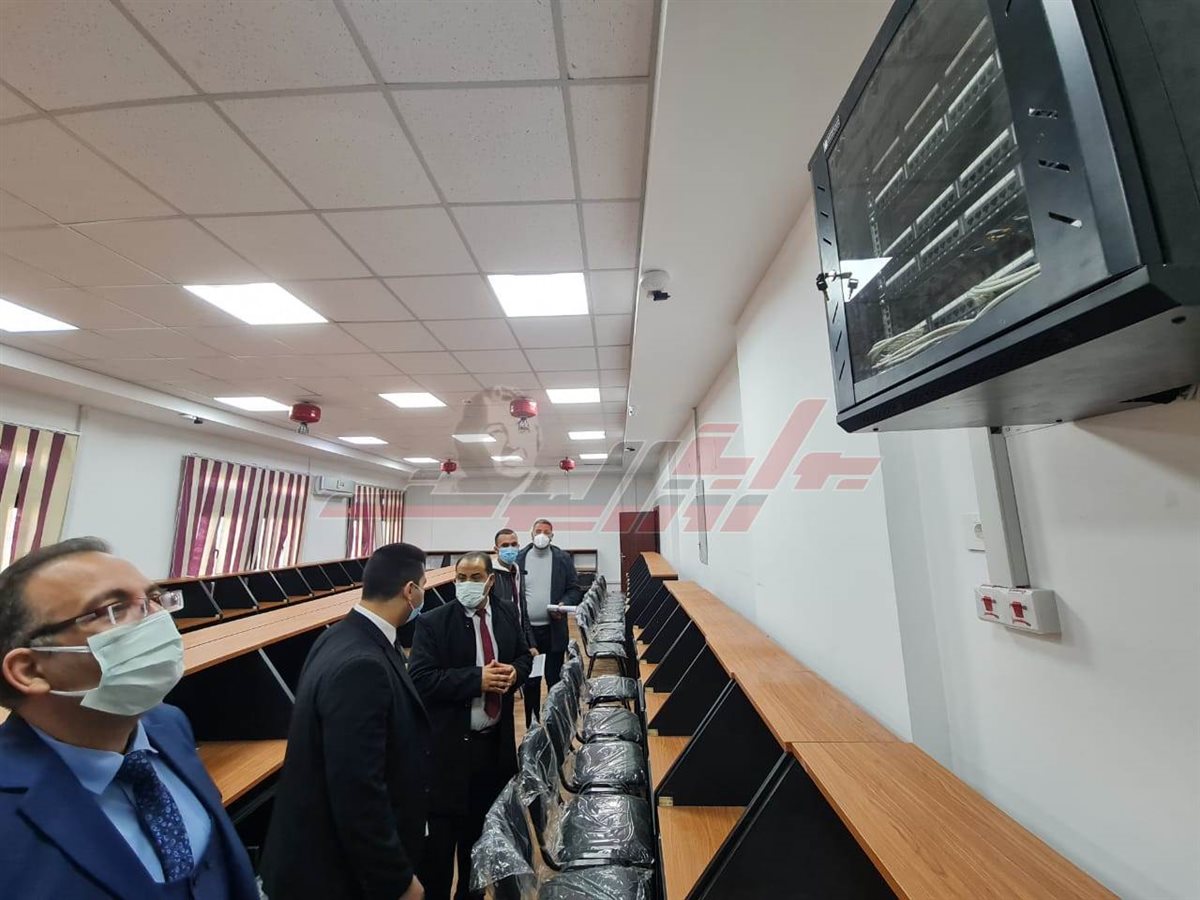 وبدأت الجولة بتفقد 6 معامل بمبني كلية رياض الأطفال وتفقد غرفة التحكم الرئيسية ووحدة الكنترول المركزية والتوصيلات الكهربائية والكاميرات وكافة التجهيزات والتأكد من مطابقتها للمواصفات ثم تم تفقد مبنى المعامل المركزية بالمجمع العلمي ومدرج برنامج صحة وسلامةالغذاء.