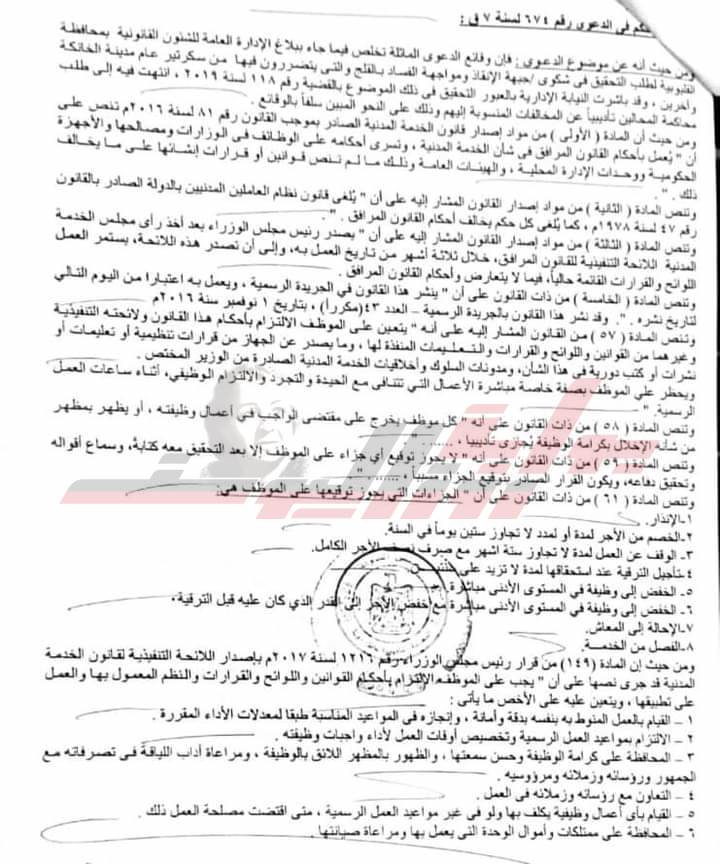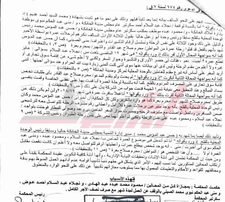 أصدرت المحكمة التأديبية بالقليوبية في الدعوى رقم ٦٧٤ سنة ٧ قضائية المقامة من النيابة الإدارية ضد "ن.ع .ا" سكرتيرة مركز ومدينة الخانكة وموظفين آخرين حكمها بالايقاف شهر مع صرف نصف الأجر الكامل.
