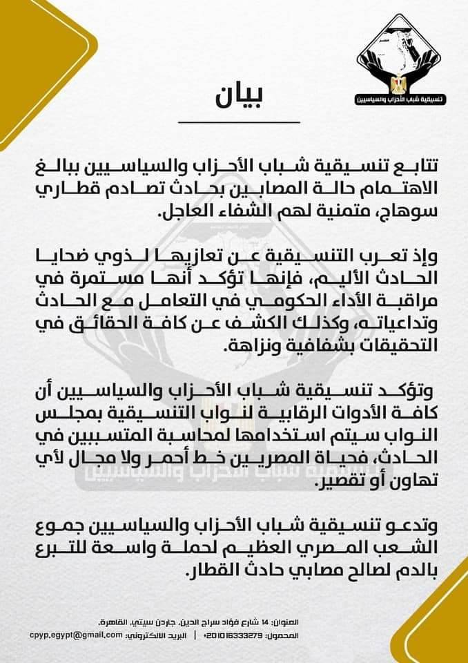 أعربت تنسيقية شباب الأحزاب والسياسيين عن تعازيها لذوي ضحايا حادث تصادم قطاري سوهاج الأليم.