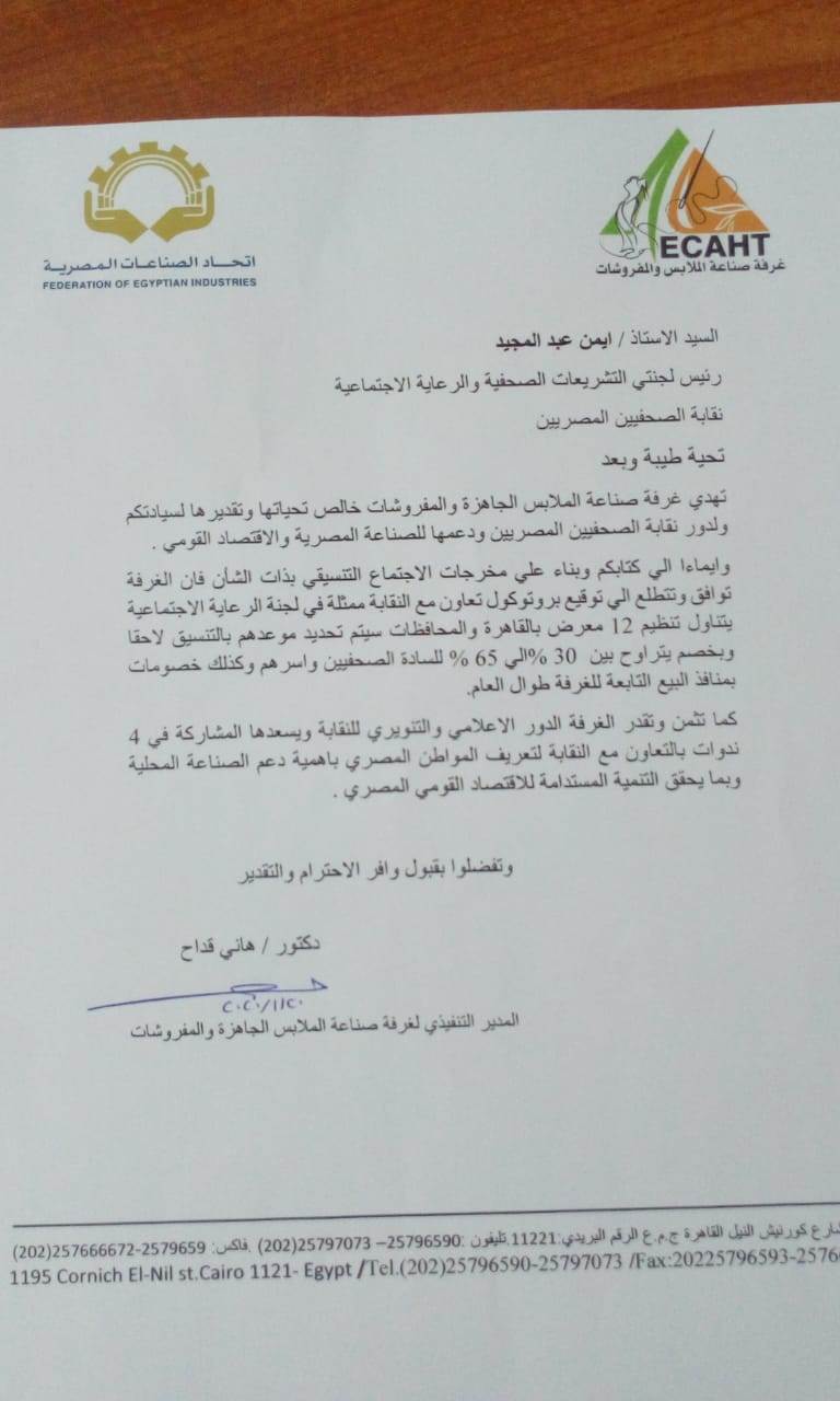 وقال عبدالمجيد، هذه الخدمة ليس الهدف منها دعاية انتخابية، بل هذا الاتفاق أبرمته بعد نقاشات ولقاءات مع قيادات الغرفة، التي تضم في عضويتها ٢٥٠٠ مصنع ملابس ومفروشات، في يناير ٢٠٢٠، وعُرض على مجلس النقابة في نوفمبر، وحظي بالموافقة على تنظيمه على مساحة ألف متر بأحد الأدوار غير المستغلة، إلا أن الإجراءات الاحترازية التي فرضتها جائحة كورونا من عزل منزلي ومنع التجمعات، حالت دون التنفيذ.