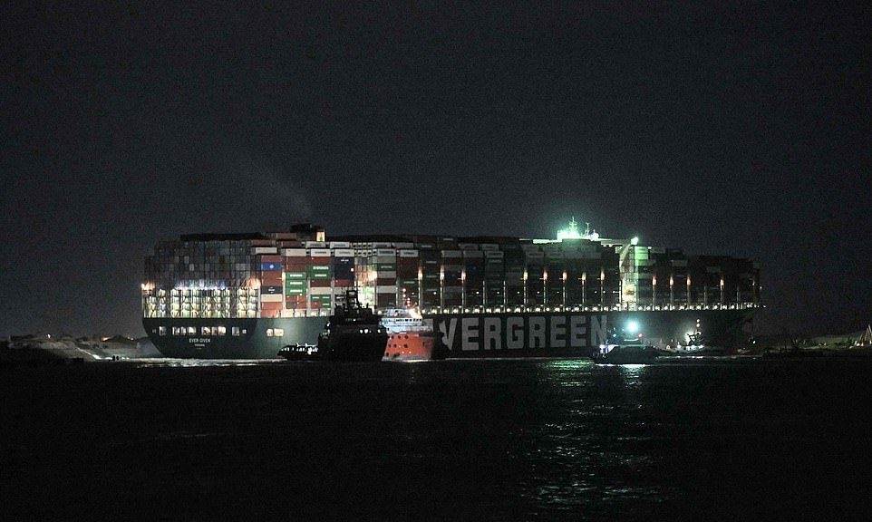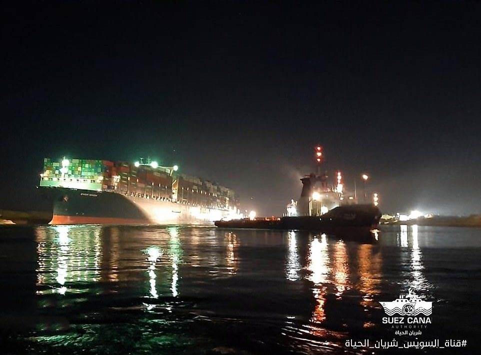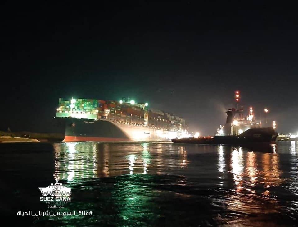 وقالت إدارة هيئة قناة السويس إن السفينة أعيد تعويمها جزئيا بعد أن استخدمت القاطرات المد العالي الذي تسبب فيه قمر عملاق لسحب السفينة التي يبلغ طولها 1300 قدم بينما قامت فرق الإنقاذ بإزالة الرمال من ضفة القناة. وقال الفريق أسامة ربيع إن أطقم الإنقاذ ستستأنف محاولاتها لسحب السفينة التي ترفع علم بنما إلى منتصف المجرى المائي في وقت لاحق اليوم الاثنين.