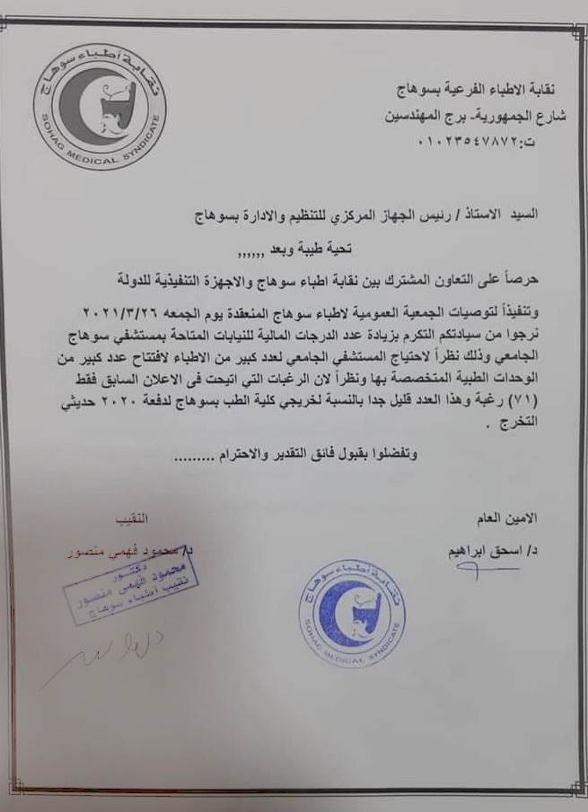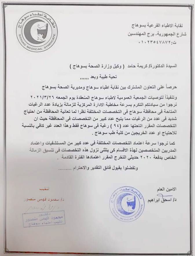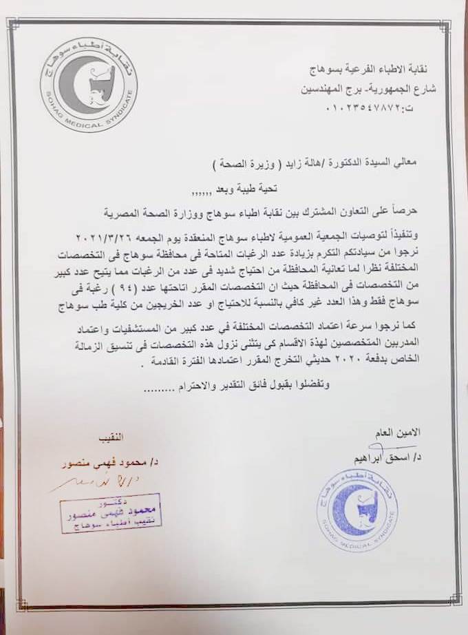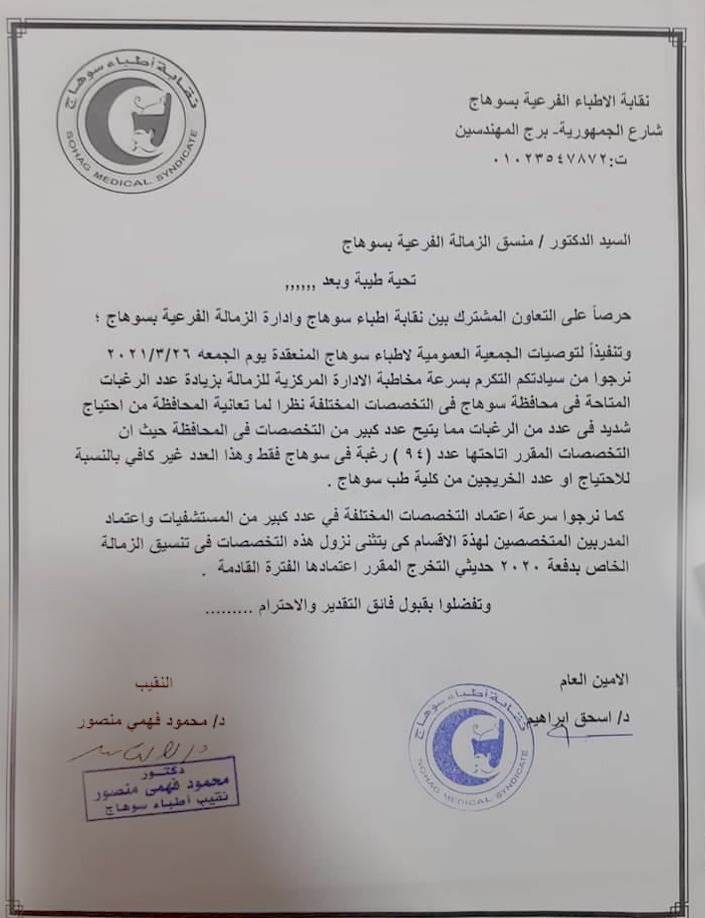 خاطبت نقابة الأطباء الفرعية بسوهاج كلا من: وزيرة الصحة د. هالة زايد وأمين عام الزمالة د. مجدى الصيرفي، للمطالبة باعتماد مستشفيات المحافظة في الزمالة المصرية والتعاقد مع مدربين لاتاحة فرص تدريب لخريجي طب سوهاج داخل محافظتهم، وذلك تنفيذا لقرار الجمعية العمومية لأطباء سوهاج التي عقدت الجمعة الماضية 26 مارس 2021.