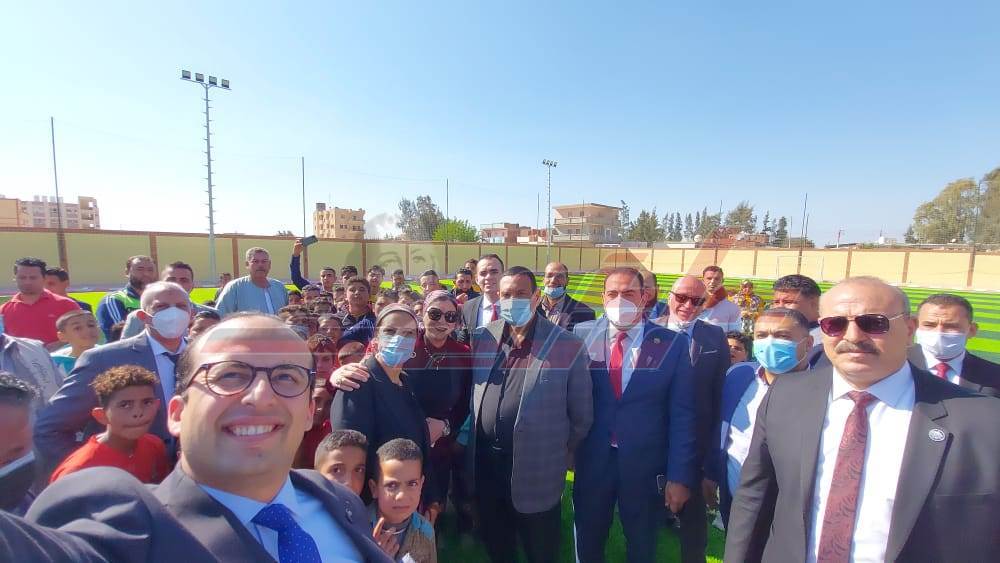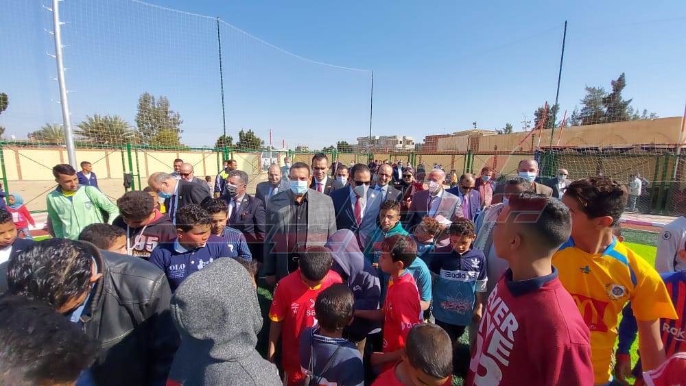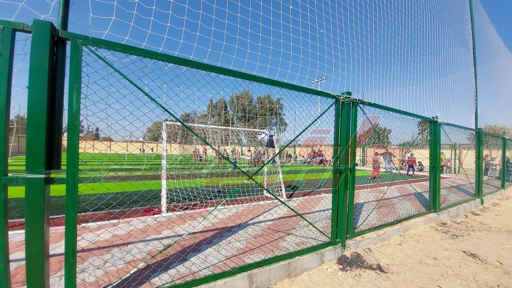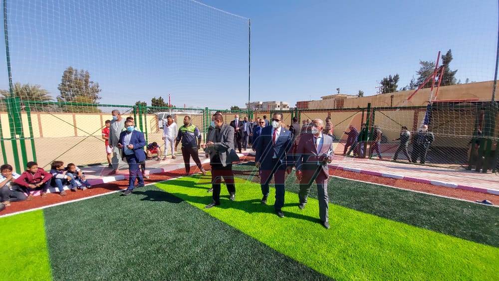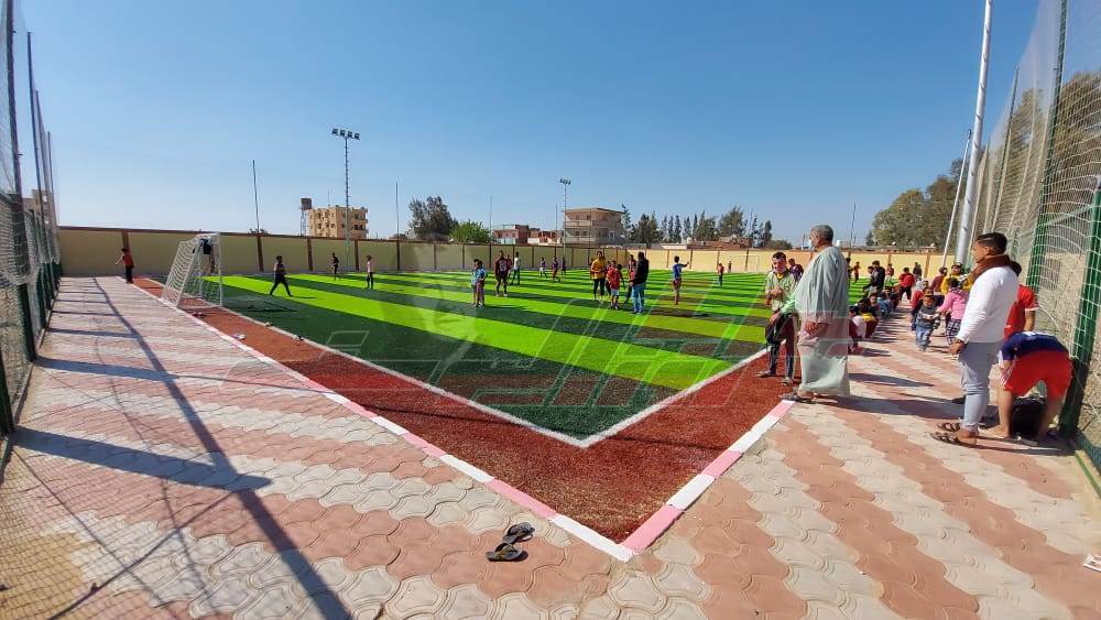 كما تم تفقد الملعب الخماسي بإجمالي اعتماد 1.2 مليون جنيه ونسبة تنفيذ 100% وهو علي مساحة 30م × 50م نجيل صناعي وعدد 4 أعمدة بكشافات ورصيف انترلوك و سور الداخلي بطول 330م حيث تم وضع طبقة السن وتركيب أعمدة الإنارة والكشافات.