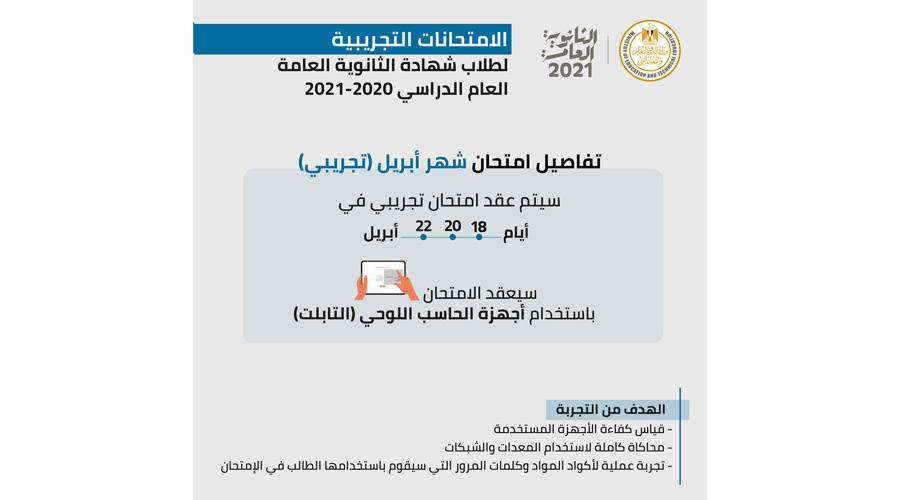 وقال وزير التربية والتعليم والتعليم الفني الدكتور طارق شوقي إن الامتحان التجريبي الأول الذي سيعقد في شهر إبريل سيخصص فقط للاطمئنان على الشبكات والتابلت وسيكون في لجان بدون أسئلة من المناهج التعليمية، مشيرا إلى أنه في اليوم الاول للامتحان التجريبي ستتمكن الوزارة من تحديد المشاكل التي حدثت والعمل على حلها.