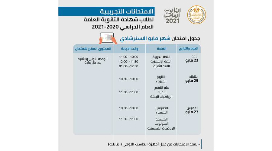 أعلن وزير التربية والتعليم الدكتور طارق شوقي أن امتحانات الثانوية العامة ستعقد في الأسبوع الأول من شهر يوليو المقبل، مشيرا إلى أنه سيتم عقد 3 امتحانات تجريبية خلال شهور إبريل ومايو ويونيو؛ للاطمئنان على كفاءة أجهزة التابلت والشبكات.
