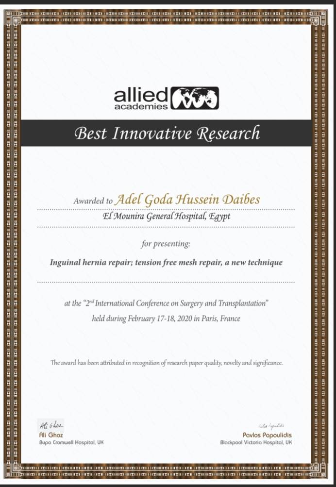 ابتكر الدكتور عادل جودة، استشاري ورئيس قسم الجراحة العامة، بمستشفى المنيرة العام، طريقة طبية جديدة لإصلاح "الفتق الإربي"، وتم نشرها لأول مرة بمؤتمر جمعية الجراحين المصرية العالمية، وتم دعوته لعرض الطريقة الطبية الجديدة، بمؤتمر الجراحة بباريس سابقًا، وحصل بحثه العلمي على جائزة أفضل بحث بالمؤتمر.