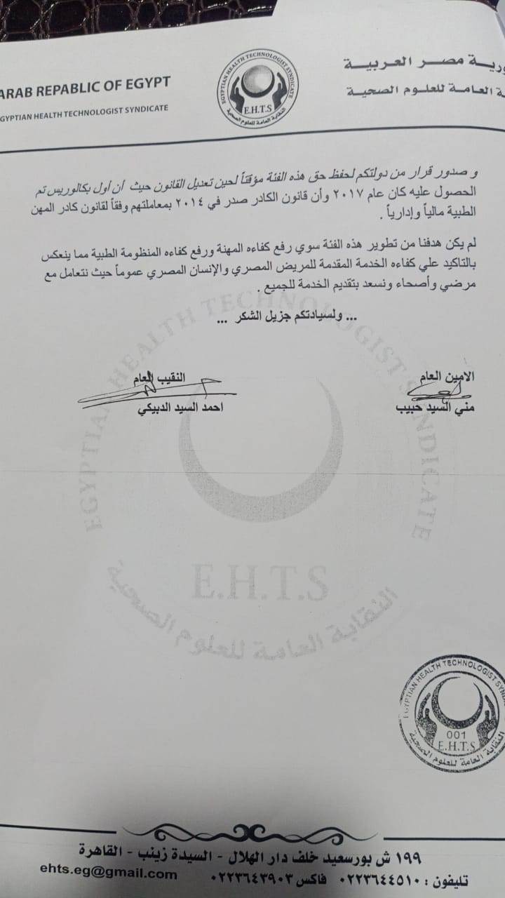 وكانت النقابة العامة للعلوم الصحية، قد خاطبت رئيس مجلس الوزراء في 3 إبريل الجاري، وجاء نص الخطاب: