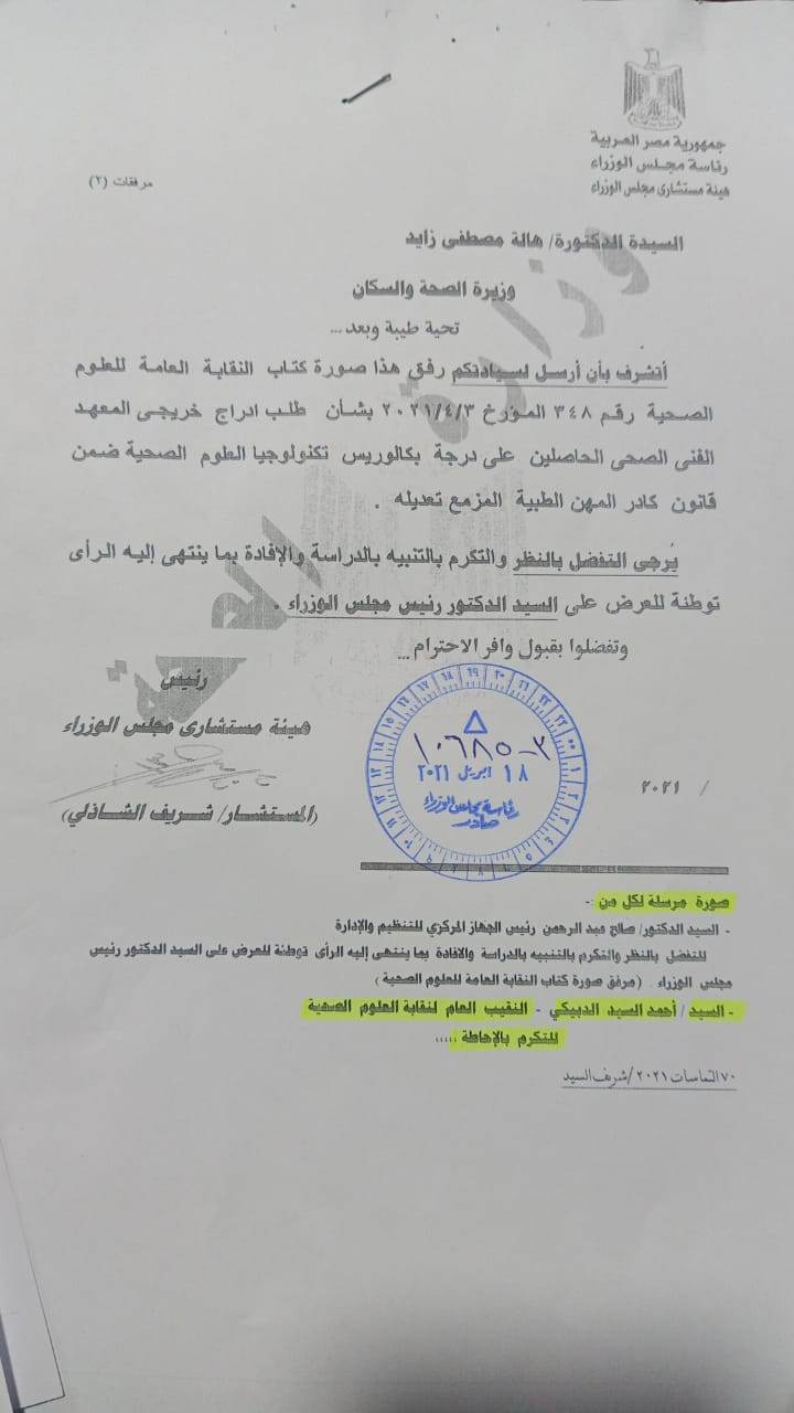 خاطبت هيئة مستشاري مجلس الوزراء، كل من د. هالة زايد، وزيرة الصحة والسكان، ود. صالح الشيخ، رئيس الجهاز المركزي للتنظيم والإدارة، بشأن كتاب النقابة العامة للعلوم الصحية رقم 348 المؤرخ في 3 إبريل 2021، بشأن طلب إدراج خريجي المعاهد الفنية الصحية الحاصلين على درجة بكالوريوس تكنولوجيا العلوم الصحية، ضمن قانون كادر المهن الطبية المزمع تعديله.