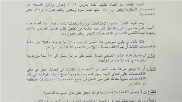 وجاءت المخاطبة كالتالى : تابعت النقابة مع أطباء تكليف دفعة مارس ۲۰۱۹ إعلان وزارة الصحة عن التخصصات المطلوبة وتبين أن 50% منها طب أسرة وتخدير وطب طواری و 50% باقی التخصصات.