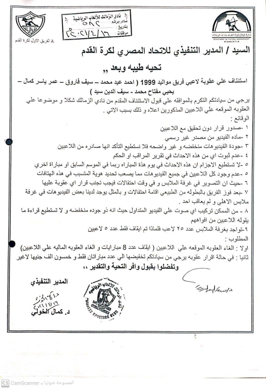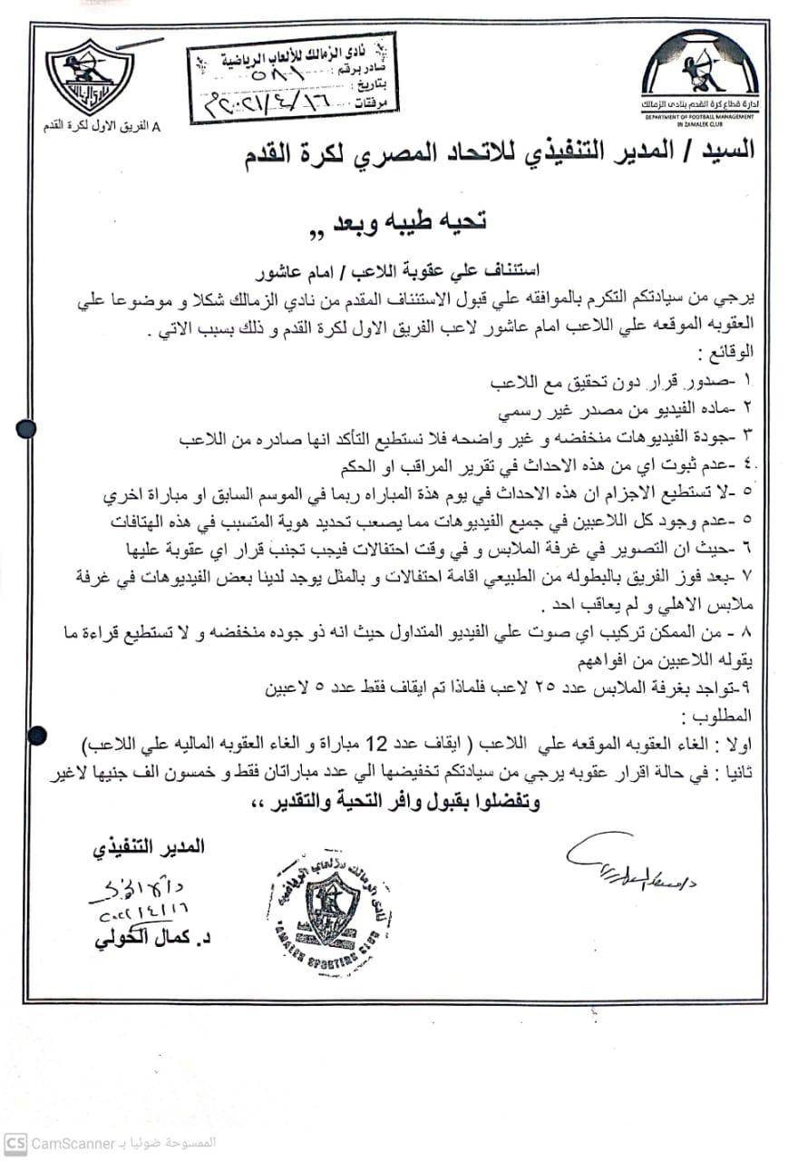 بالمستدات.. الزمالك يؤكد التقدم باستئناف ضد عقوبة إمام عاشور