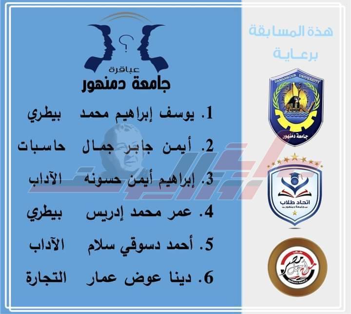 وفاز بالمركز الأول الطالب يوسف إبراهيم محمد بكلية الطب البيطري والمركز الثانى الطالب أيمن جابر جمال بكلية الحاسبات والمعلومات والمركز الثالث الطالب ابراهيم أيمن حسونه بكلية الآداب والمركز الرابع الطالب عمر محمد إدريس بكلية الطب البيطري والمركز الخامس الطالب أحمد دسوقي سلام بكلية الآداب والمركز السادس الطالبة دينا عوض عمارة بكلية التجارة.