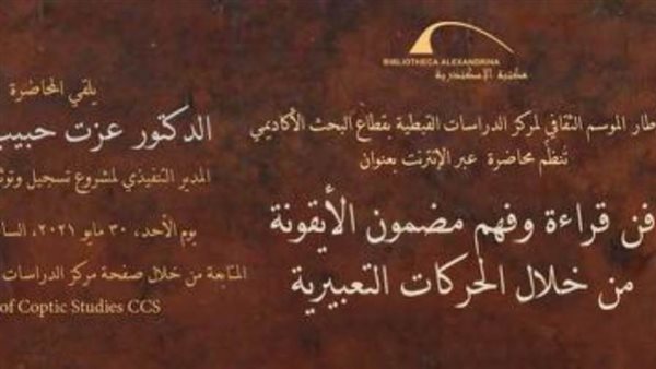 تنظم مكتبة الإسكندرية محاضرة بعنوان "فن قراءة وفهم مضمون الأيقونة من خلال الحركات التعبيرية"، يحاضر فيها الدكتور عزت حبيب صليب، وذلك عبر الانترنت يوم الأحد الموافق 30 مايو 2021، في تمام الساعة 3.00 مساًء.