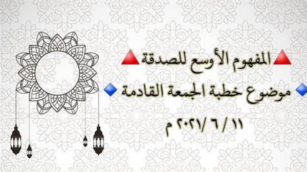 حددت وزارة الأوقاف موضوع خطبة الجمعة القادمة ١١ /٦ ٢٠٢١ م لتكون تحت عنوان: ”المفهوم الأوسع للصدقة“، مع التأكيد على جميع الأئمة الالتزام بموضوع الخطبة نصًّا أو مضمونًا على أقل تقدير، وألا يزيد أداء الخطبة عن عشر دقائق للخطبتين “الأولى والثانية” مراعاة للظروف الراهنة ، مع ثقتنا في سعة أفقهم العلمي والفكري ، وفهمهم المستنير للدين، وتفهمهم لما تقتضيه طبيعة المرحلة .