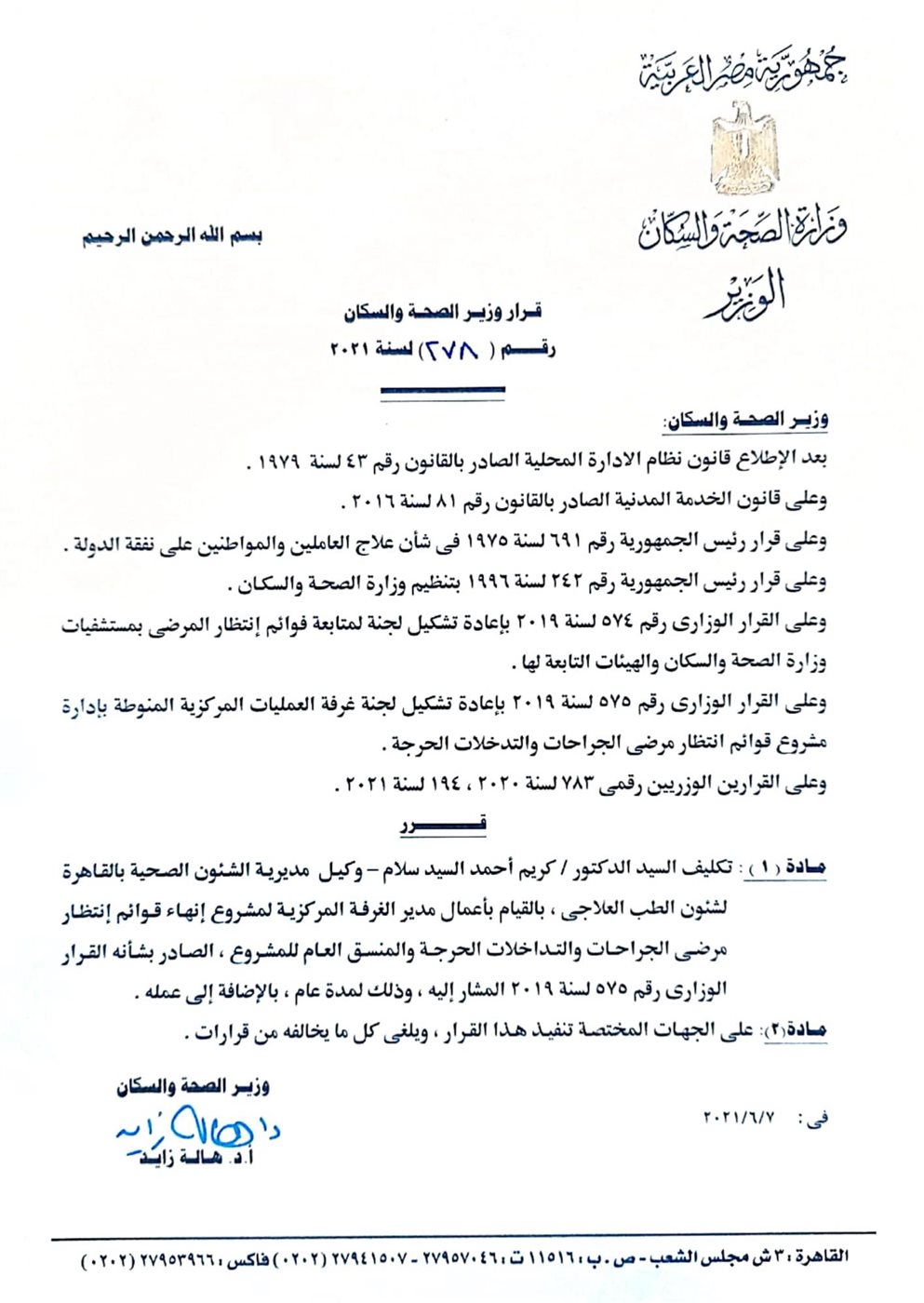 أصدرت د. هالة زايد، وزيرة الصحة والسكان، القرار رقم 278 لسنة 2021، بتكليف د. كريم أحمد السيد سلام، وكيل مديرية الشؤون الصحية بالقاهرة لشؤون الطب العلاجي، بالقيام بأعمال مدير الغرفة المركزية لمشروع إنهاء قوائم انتظار مرضى الجراحات والتداخلات الحرجة والمنسق العام للمشروع، الصادر بشأنه القرار الوزاري رقم 575 لسنة 2019، وذلك لمدة عام، بالإضافة إلى عمله.