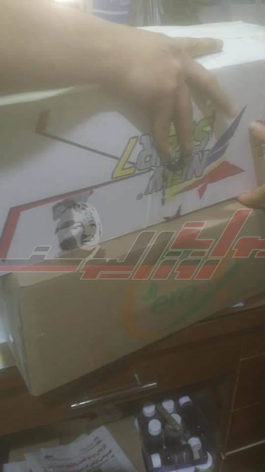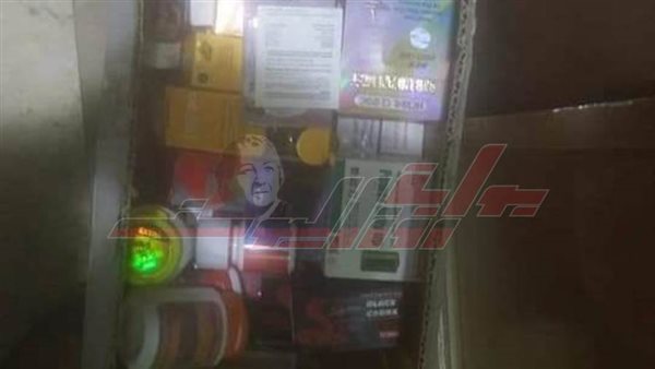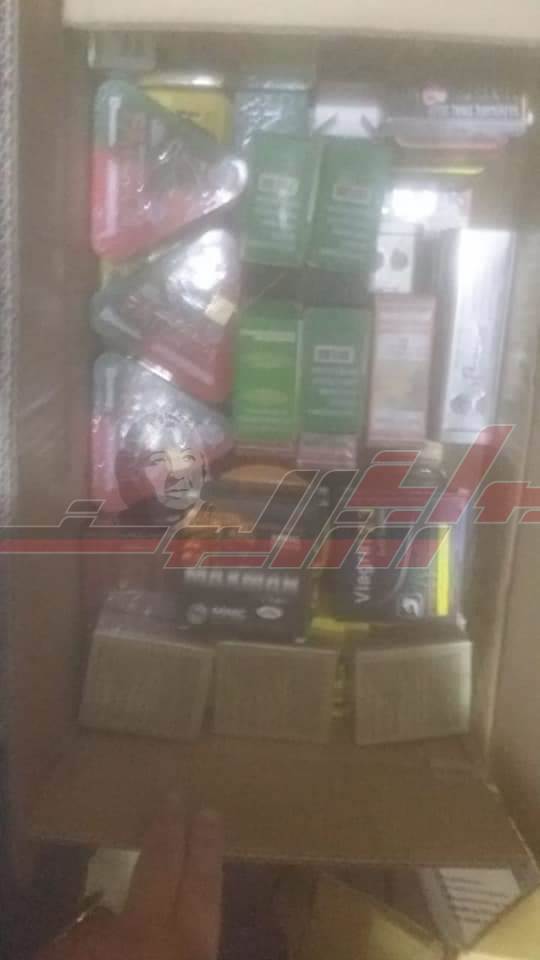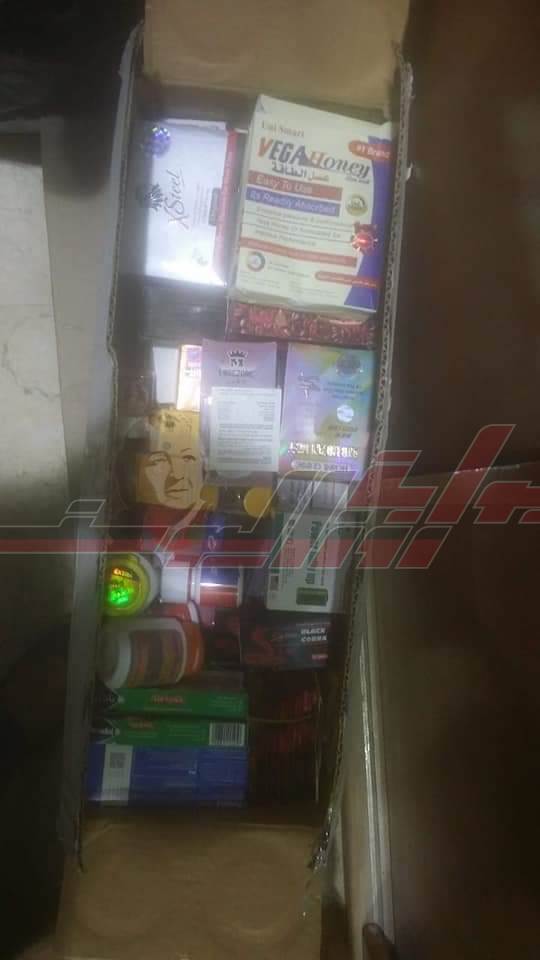 و24 علبة كرتونية مفضضة غير مدون عليها تاريخ الصلاحية، بإجمالي 3473 قرصا، وعلب كرتونية بها أكياس مجهولة المصدر بعدد 33 علبة.