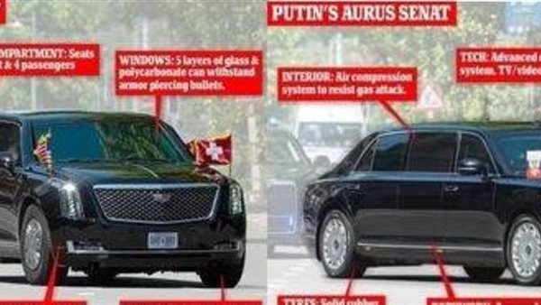 ووفقًا لصحيفة “ديلي ميل”، البريطانية، فإن زعيما روسيا والولايات المتحدة يجلسان في سيارتين ليموزين مضادتين للرصاص ومقاومتين للقنابل ومجهزان بالعديد من الميزات السرية للغاية.