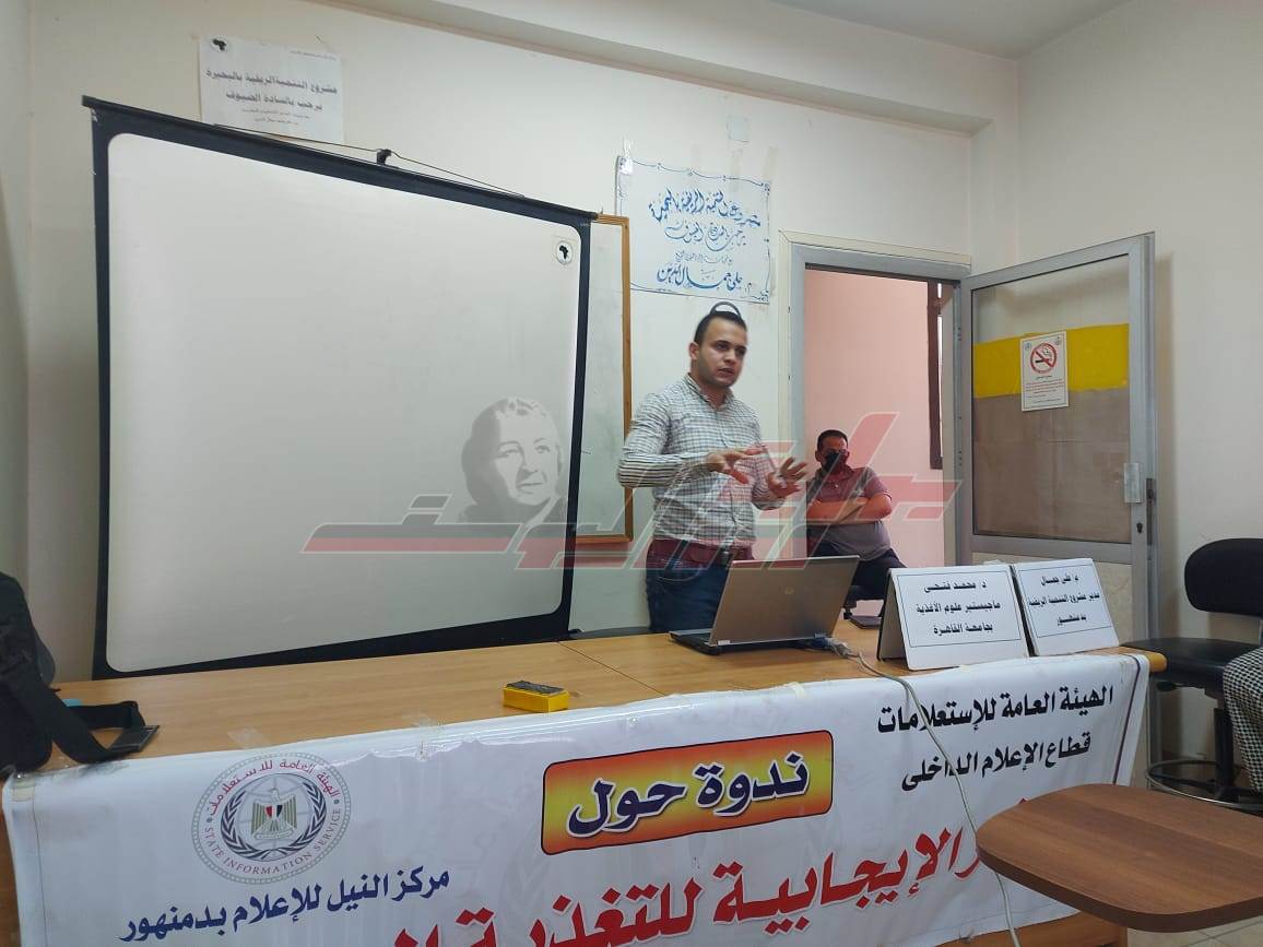 نظم مركز النيل للإعلام بالتعاون مع مشروع التنميه الريفية بالبحيرة ندوة تثقيفية بعنوان "الآثار الإيجابية للتغذية السليمه بمقر مشروع التنمية الريفية بدمنهور حاضر فيها الدكتور محمد فتحى - دبلوم التغذية العلاجية وماجيستير علوم الاغذيه.