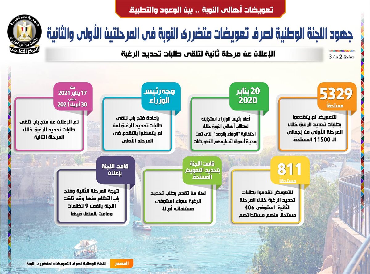 هذا وقد تم الإعلان عن مرحلة ثانية لتلقي طلبات تحديد الرغبة، وذلك بعد وجود 5329 مستحقاً للتعويض لم يتقدموا بطلبات تحديد الرغبة خلال المرحلة الأولى، ليعلن رئيس الوزراء استجابته لمطالب أهالي النوبة خلال احتفالية "الوفاء بالوعد" التي تمت بمدينة أسوان لتسليمهم التعويضات في 20 يناير 2020.