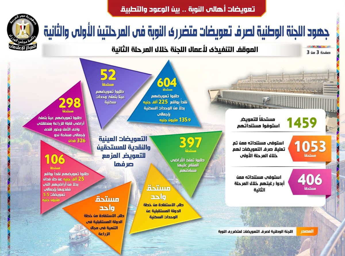 وفي هذا الصدد، نشر المركز الإعلامي لمجلس الوزراء، تقريراً تضمن إنفوجرافات تسلط الضوء على جهود اللجنة الوطنية لصرف تعويضات متضرري النوبة في المرحلتين الأولى والثانية.