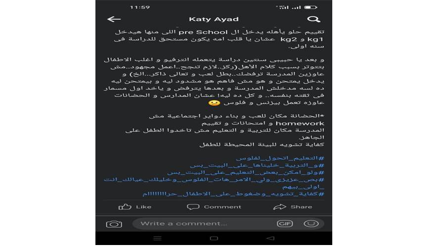 وأصبحت هذه الفترة بالنسبة لكل أم وأب بمثابة بركان عصبي وتوتر وعبء على كل منهما، وذلك يؤثر بالسلب على مستوى الطفل الذي ليس له أى ذنب بهذه المهزلة التي يعيش بداخلها، فيجب على كل مؤسسة تعليمية أن تساعد أولياء الامور فى تربية وتعليم الابناء لأن مستوى وفكر الطفل يتأثر بالبيئة الخارجية المحيطة به اكثر من البيئة الداخلية “المنزل” ويجب أيضاً أن تساهم فى تنمية قدرات ومهارات الاطفال حتى وان وجد اى عيب في قدراته التي لم تحدد بعد في هذه السن الصغيرة، حيث أن ربنا وضع فى كل طفل موهبة تميزه عن غيره واستجابة كل طفل تختلف من عقلية لأخرى، فلا يجب أن استهين بهذه القدرات مقابل المستوى المادى او الاجتماعى او التعليمى لان اغلب المتفوقين ابناء ناس بسيطة بعيدة عن المظاهر والشكليات التي تهتم بها اغلب المدارس حالياً.