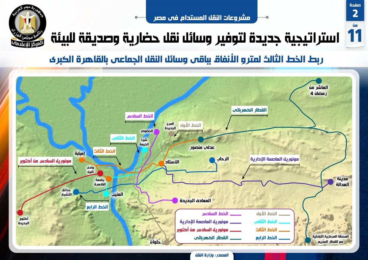 وفي هذا الصدد نشر المركز الإعلامي لمجلس الوزراء تقريراً تضمن إنفو جرافات تسلط الضوء على مشروعات النقل المستدام في مصر، والتي تأتي ضمن الاستراتيجية الجديدة للدولة لتوفير وسائل نقل حضارية وصديقة للبيئة.