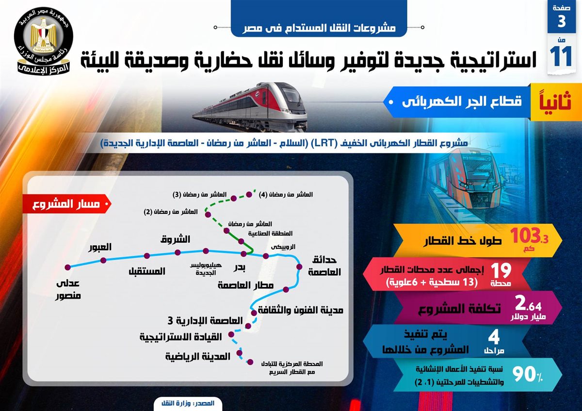 واستعرض التقرير مشروعات قطاع الجر الكهربائي، حيث تشمل مشروع القطار الكهربائي الخفيف (LRT) (السلام – العاشر من رمضان – العاصمة الإدارية الجديدة)، الذي يتم تنفيذه على 4 مراحل بطول 103.3 كم، وبإجمالي 19 محطة منهم 13 محطة سطحية و6 محطات علوية، وبتكلفة تبلغ 2.64 مليار دولار، هذا ووصلت نسبة تنفيذ الأعمال الإنشائية والتشطيبات للمرحلتين الأولى والثانية من المشروع إلى 90%.