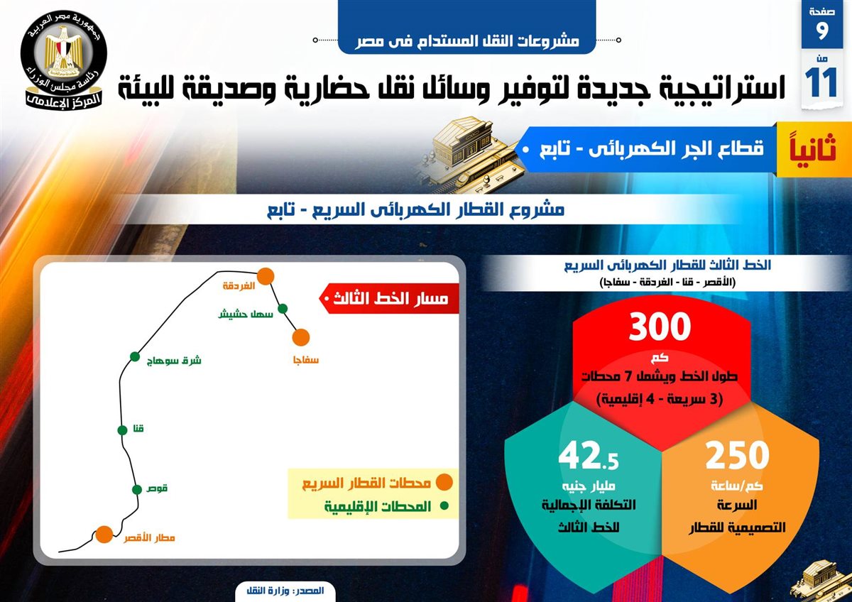 أما فيما يتعلق بالخط الثالث من مشروع القطار الكهربائي السريع، (الأقصر، قنا، الغردقة، سفاجا)، أوضح التقرير أن سرعته التصميمية تبلغ 250 كم/ ساعة، وتصل تكلفته الإجمالية لنحو ٤٢,٥ مليار جنيه، ويشمل ٧ محطات بواقع ٣ محطات سريعة و٤ محطات إقليمية، وذلك بطول ٣٠٠ كم.