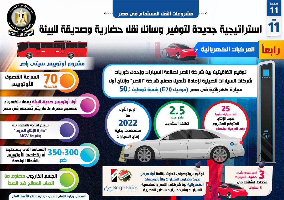 وتناول التقرير الحديث عن محور المركبات الكهربائية كأحد أدوات الدولة لتوفير وسائل نقل حضارية وصديقة للبيئة، لافتاً إلى أنه تم توقيع اتفاقيتين بين كل من شركة النصر لصناعة السيارات وإحدى كبريات شركات السيارات الصينية لإعادة تأهيل مصنع شركة "النصر"، وإنتاج أول سيارة كهربائية في مصر (موديل E70) بنسبة توطين 50%.