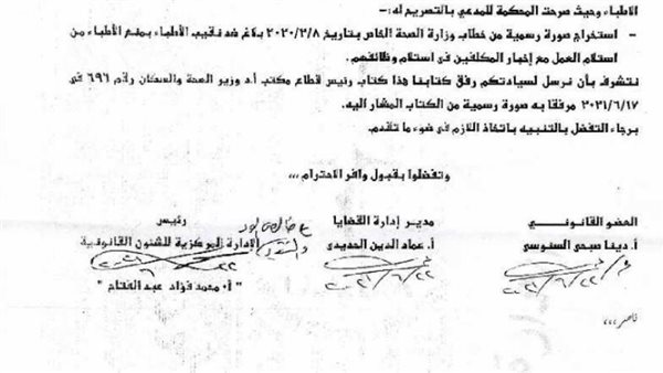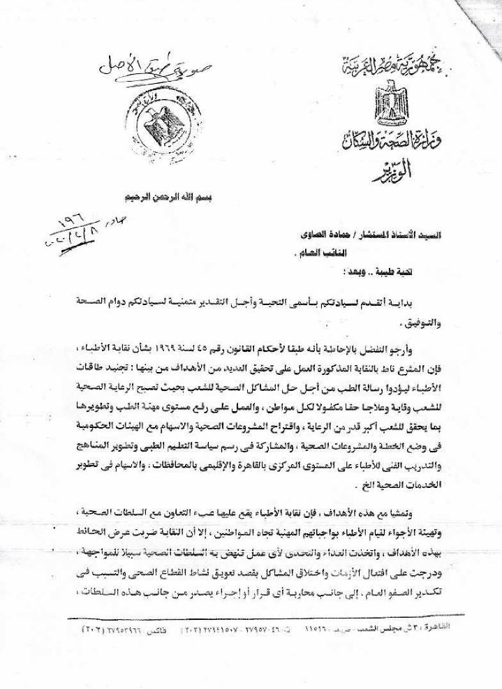 ننشر مستندا مهما لوزيرة الصحة في قضية فرض الحراسة على نقابة الأطباء