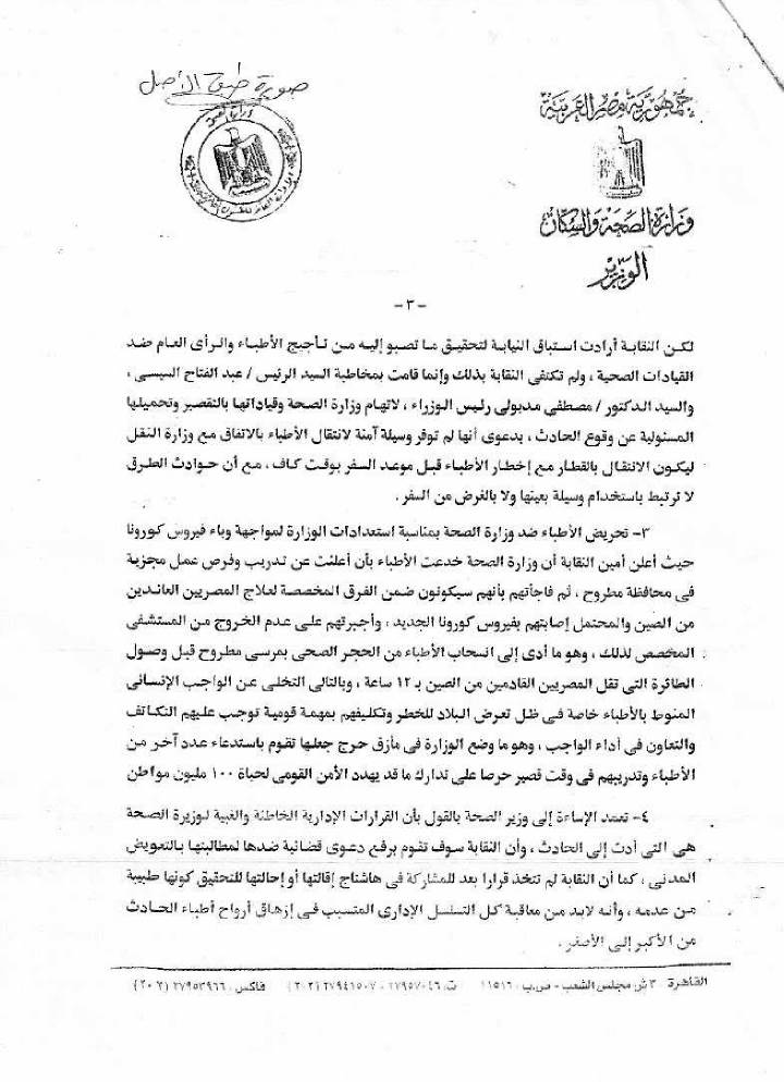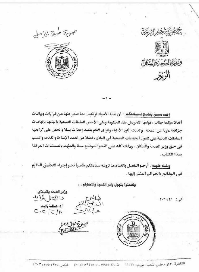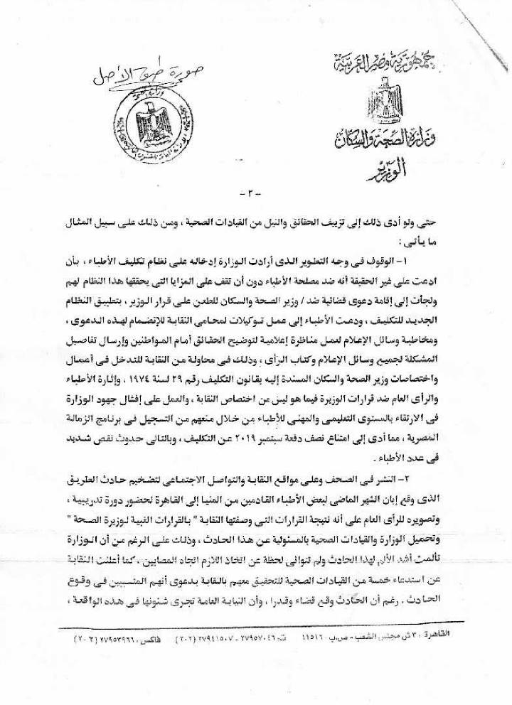 وجاء في المستند الذي أمرت المحكمة وزيرة الصحة بتقديمه، قيام نقابة الأطباء بالضرب عرض الحائط بمصالح الشعب والوطن وبالأهداف التي أنشأت النقابة من أجلها، وفقا لقانونها، واتخاذ العداء والتحدي سبيلا لمواجهة مجهودات الدولة والسلطات الصحية وافتعال الأزمات واختلاق المشاكل، بقصد تعويق نشاط القطاع الصحي والتسبب في تكدير الصفو العام، ومحاربة قرارات السلطات الصحية، وتزييف الحقائق والنيل من القيادات الصحية، وإثارة الأطباء والرأي العام ضد قرارات وزارة الصحة، فيما هو ليس من اختصاصات النقابة، والعمل على إفشال جهود وزارة الصحة في الارتقاء بالمستوى التعليمي والمهني للأطباء، من خلال منعهم من التسجيل في برنامج الزمالة المصرية وتسببهم في امتناع أطباء دفعة 2019 عن التكليف وحدوث نقص شديد في عدد الأطباء.