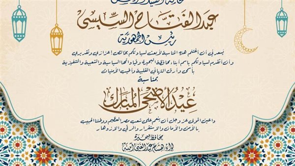 جاء فيها: يطِيب لِي أَن أَغَتنم هَذه المُناسبة لأَبَعث لِفَخامَتكم بِخالص إِعَزازِي وتَقَدِيرِي لِشَخصكم الكَريم وأَن أَتَقدم لِسيَادتَكم بِاسم أَبَناء مُحافَظة البحيرة وقِيَادَاتَها السَياسية والشَعبَية والتَنفِيذَية، بأَسمى وأَرق التَهاني القَلبية و أَطيَب الأُمنَيات بِمُناسبة عِيد الأضحى المُبارك، عِيد التَضَحَية والفداء أَعَادة الله عَليكم وعَلى الأُمة الإِسَلامية والعربية بِالخَير واليُمن والبَركات، دَاعِين المَولى عَز وجَل أَن يَنعَم عَلى شَعب مِصر العَظيم، ووَطَننا الغَالي بالأَمَن والأَمَان والإِسَتقـرار والسَـلام ، وأَن يعِيدهَا عَليَكم بِمَوَفُور الصَحة والسَعادة سدد الله خطاكم ، وكَلل بِالنَجاح مَساعِيكم الحَمِيدة ومجهوداتكم المخلصة، و يُوفَقكم فِى تَحَقِيق طموحات وآمال أبناء هذا الوطن من عِزة وكَرامة وتَقدم وإِزدهَار، في ظِل مَناخ يَنعم فِيه أَبنَاء مَصر الأَوفَياء بالأَمن والأَمان والإِسَتقرار لِتحَقِيق غَدٍ أَفَضل ومُستقبل مُشرق لمِصرنا الحَبيبة، و كَل عَام و سِيادَتِكم و شَعب مَصر بِقَيادتَكم الرَشِيدة بِخَير وسَلام.