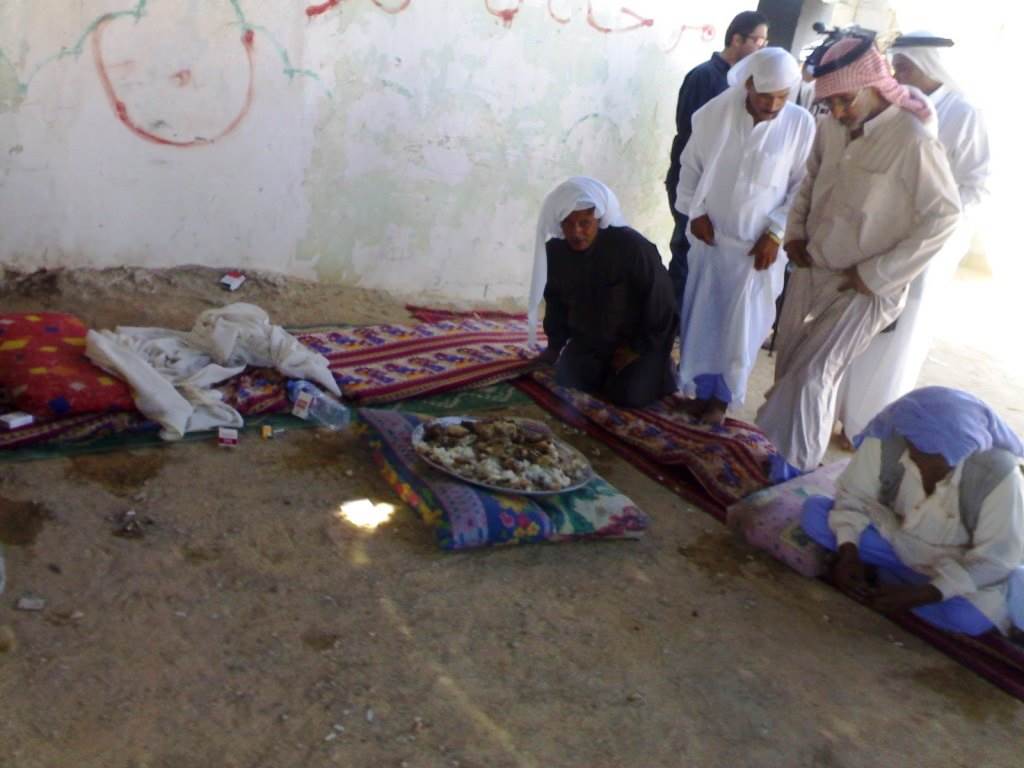 حيث ينتظرهم هناك المشايخ والعواقل من كبار العائلة، ويتناولون طعام الإفطار من اللحوم والكبدة سويا، ثم يخرجون لزيارة الأهل والأقارب من آباء وأبناء وأعمام وعمات وأخوال وخالات وغيرهم، سواء من المتزوجين والمتزوجات من أبناء نفس القبيلة أو القبائل المجاورة، ويتم تبادل التهانى وتقديم هدايا العيد، ومن المتبع منح الأخوات أو البنات المتزوجات ربع الضحية وتقسيم الباقى بين بيته والأصدقاء والفقراء.